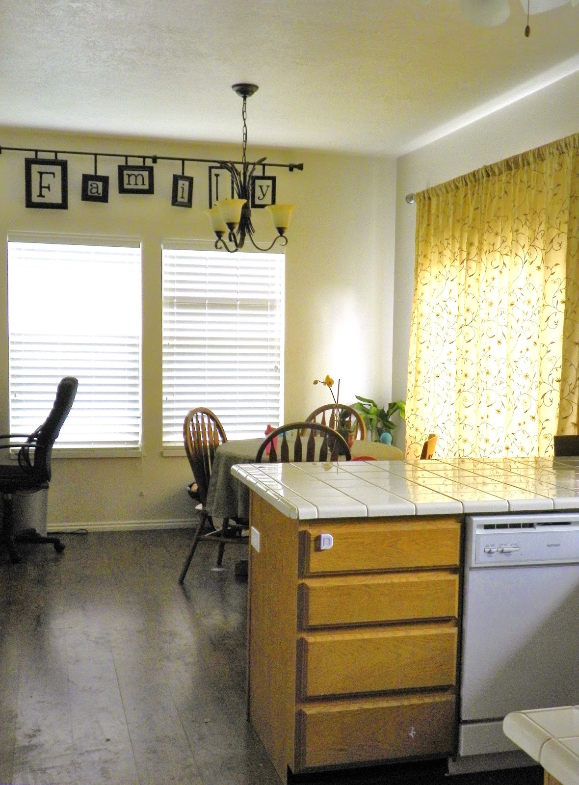 Not only did I hate the countertops but I hate the builders grade oak cabinets - they just look so average to me and the white paint had been around too long. I love having color, not just white in my house! To top it all off see those two dining room windows? The lack of trim around them just made them look ---- naked, boring, blah. Our floor was also something I had wanted to replace as whoever previously installed it made sure there were gaps all through out so we would always have dirt built up in the gaps.